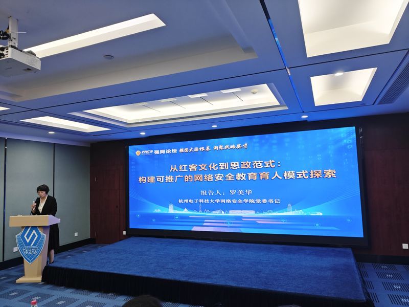在分论坛上,学院党委书记罗美华以《从红客文化到思政范式:构建可推广的网络安全教育育人模式探索》为题,向国内同行系统阐述了学院的育人理念与实践路径。报告指出,面对传统网络安全教育中“重技术、轻素养”与思政教育“重理论、轻实践”的现实困境,学院独辟蹊径,深度挖掘并系统提炼了以“红”的底色、“客”的担当、“守”的准则、“创”的智慧为核心的“红客文化”,将其视为实现技术与思政深度融合的“宝贵富矿”与“理想载体”。